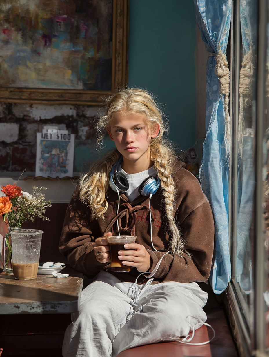 Example 3 (Missy in a cafe): “Hyper-realistic portrait of a teenager sitting in a cafe holding a cup of coffee and wearing headphones while sitting next to a window with natural light --seed 3969075217”